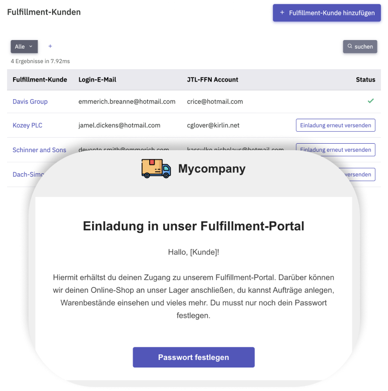 Der Online-Handel lebt von Zahlen, Prozessen und Kostenoptimierung. Biete deinen Kunden ein Fulfillment-Portal, über welches der gesamte Informationsaustausch abgebildet wird - Aufträge, Lagerbestand, Retouren und Kommunikation.